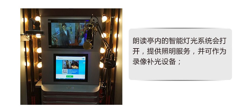 2、朗讀者進(jìn)入朗讀亭后,朗讀亭內(nèi)的智能燈光系統(tǒng)會(huì)打開(kāi),提供照明服務(wù),并可作為錄像補(bǔ)光設(shè)備;