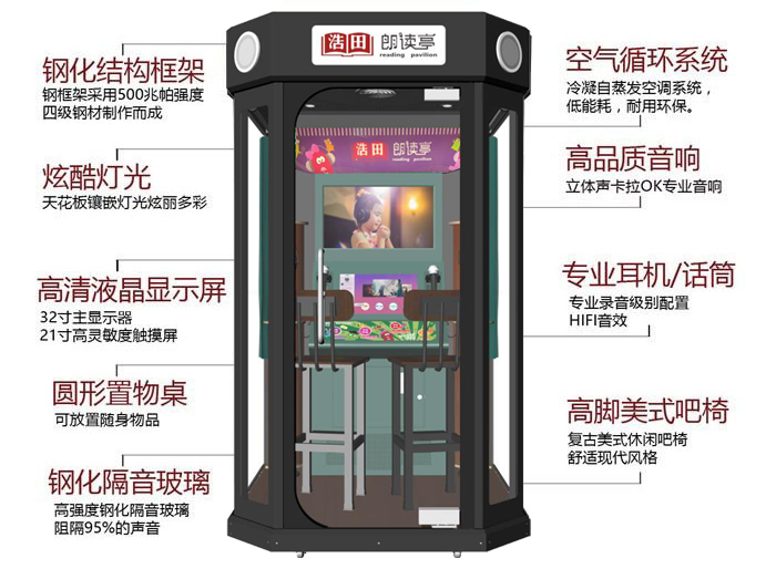 7.唱歌朗讀亭:全國首創豪華版唱歌+朗讀二合一的朗讀亭。可自由切換朗讀模式和唱歌模式,朗讀可設置成免費,唱歌可設置為多少元一首或者多少元多少分鐘。