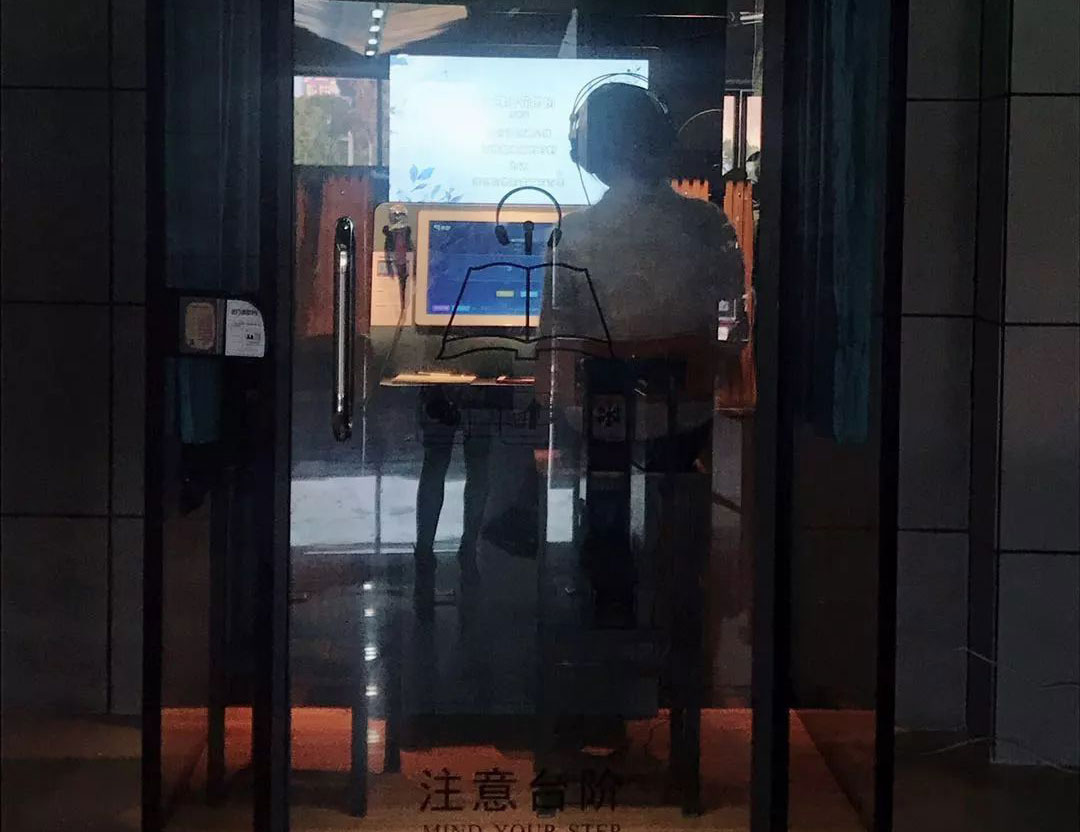 在該圖書館二樓看到這座朗讀亭,高約3米,寬約1.6米,四周以隔音玻璃圍成,亭內(nèi)正前方有兩塊屏幕用以顯示操作系統(tǒng)和播放篇目,兩套朗讀設(shè)備包括耳機(jī)和話筒分列屏幕兩側(cè),可供兩位朗讀者同時(shí)使用。